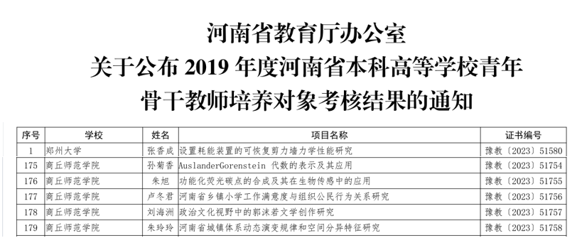 近日,河南省教育厅下发《关于公布2019年度河南省本科高等学校青年骨干教师培养对象考核结果的通知》(教办高〔2023〕285号),我校孙菊香、朱旭等五名2019年度河南省本科高等学校青年骨干教师培养对象顺利通过考核。