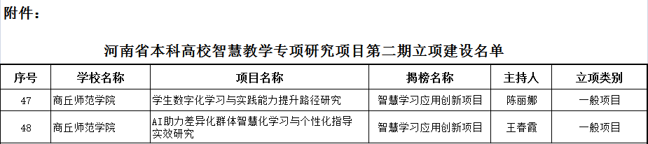 近日,河南省教育厅公布了2023年度河南省本科高等学校智慧教学专项研究项目第二期立项建设名单,由我校信息技术学院陈丽娜教授申报的《学生数字化学习与实践能力提升路径研究》和王春霞教授申报的《AI助力差异化群体智慧化学习与个性化指导实效研究》2个项目获批立项建设。