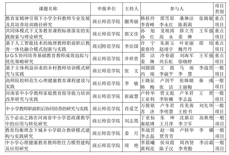 近日,河南省教育厅发布《关于公布2024年度教师教育课程改革研究项目立项名单的通知》(教师〔2024〕12号),我校申报的11项教师教育课程改革研究项目获批立项,其中重点项目获批4项,一般项目获批7项。