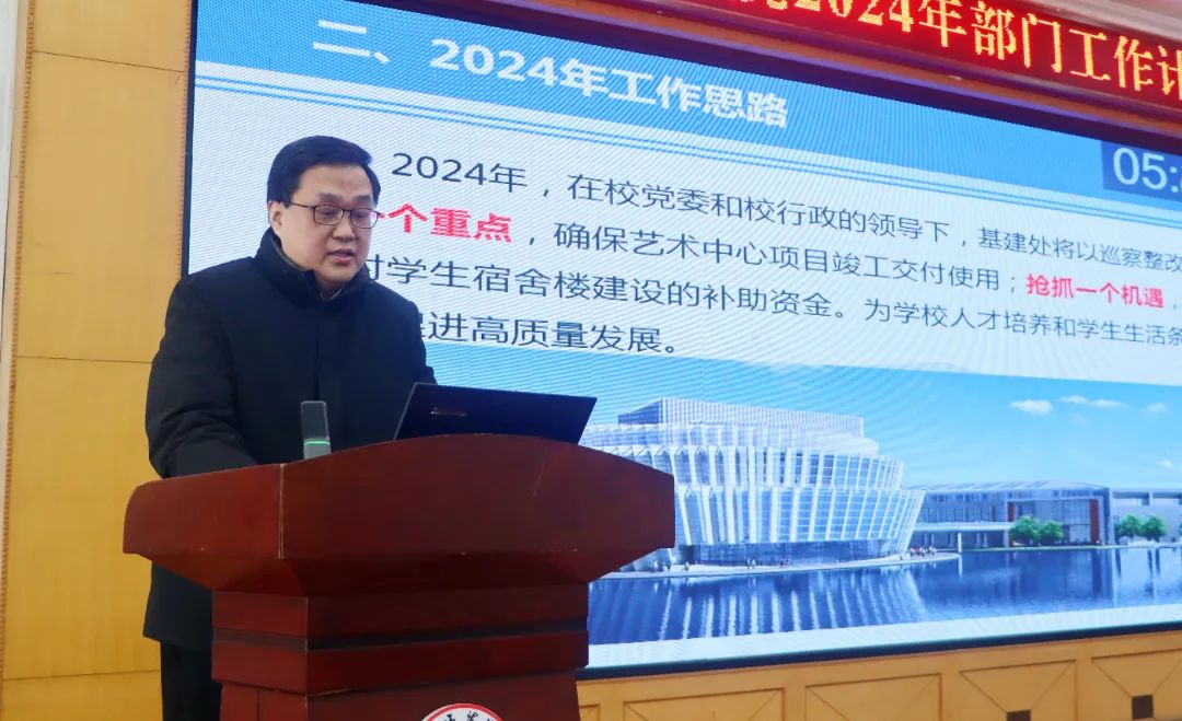 一、2023年工作总结。工科实训中心交付使用。艺术中心打造标杆工程。完成睢阳校区学生宿舍楼可研报告的编制。完成了四个专项工程项目。二、2024年工作思路。在校党委和校行政的领导下,基建处将以巡察整改工作为引领,把握一个重点,确保艺术中心项目竣工交付使用;抢抓一个机遇,积极争取上级财政对学生宿舍楼建设的补助资金。三、2024年工作计划。1、艺术中心项目今年上半年竣工交付使用。根据施工计划,艺术中心室外配套工程5月份能完工,全部室外配套工程将于6月底完成。目前存在的困难是工期紧、任务重,资金支付压力大,同时天气对室外工程施工的影响还存在不确定因素。2、睢阳校区学生宿舍楼今年下半年开工建设。基建处在校领导的亲自指导下,新建学生宿舍楼的选址和方案最终确定最佳方案。得到了省教育厅和省发改委的大力支持,第一批获得省发改委批复,有望申请到中央财政补助资金,理想的话最多争取到1个亿的中央补助,我们同时联合财务处申请了政府专项债资金支持。3、梁园校区体育馆、国培学员宿舍楼立项审批工作。目前省发改委已批复同意进行梁园校区体育馆、国培学员宿舍楼建设,两个项目的项目申请报告已编制完成,可以向省教育厅和省发改委报批。可以作为储备项目积极争取财政资金支持,国培学员宿舍楼立项完成后,即可开始实施。4、完成睢阳校区体育场地维修改造。睢阳校区田径场使用寿命为8年,实际使用时间已达到15年之久。部分场地存在严重安全隐患,我们计划今年完成睢阳校区体育场地维修改造。5、完成睢阳校区校园建设规划设计。目前睢阳校区是由三个学校合并后成立,缺乏统一的规划,加之部分老旧建筑将要拆除,需要通过睢阳校区校园建设规划设计,提升校区的整体形象和环境质量。