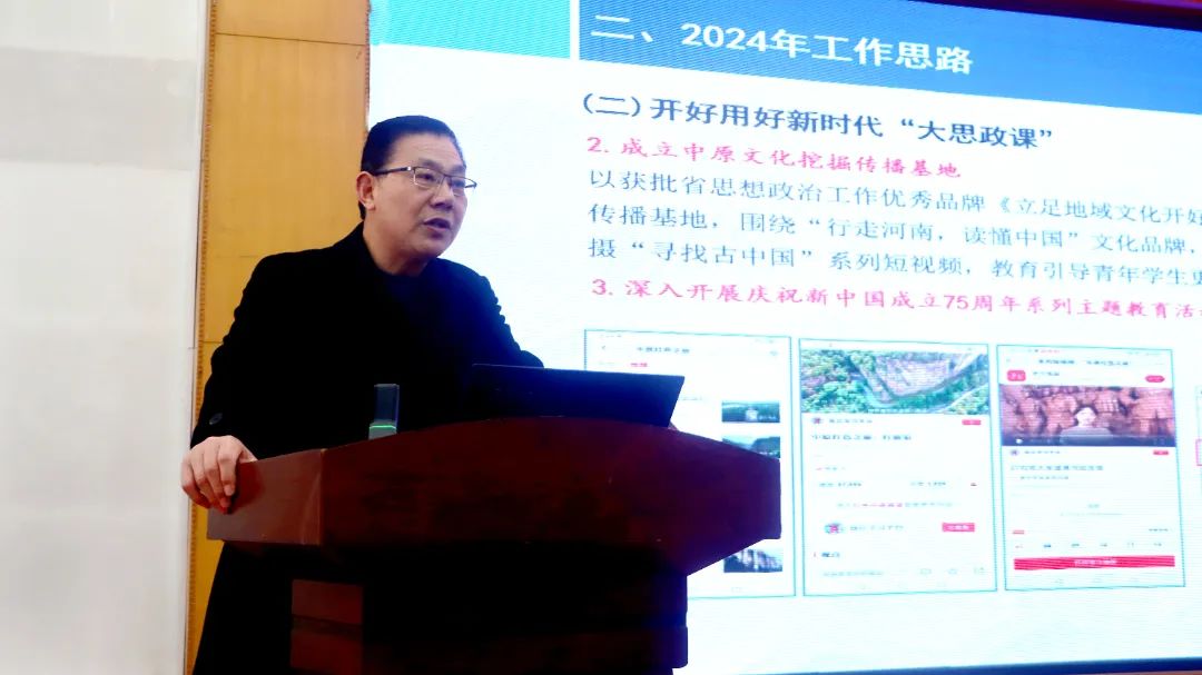 一要坚持不懈用习近平新时代中国特色社会主义思想凝心铸。突出抓好习近平文化思想学习宣传,推进“四个融入”,打造文化育人特色。严格三项学习制度,确保及时学、研讨学、全员学。落实“四个着力”,抓好三支宣讲队伍建设,推动实践笃行见成效。二要开好用好新时代“大思政课”。统筹推进学校融媒体中心和“融媒体+育人”试点(培育)单位建设,探索构建“333”网络育人模式。成立中原文化挖掘传播基地,围绕“行走河南,读懂中国”文化品牌,在成功创作“黄河之旅”“中原红色之旅”基础上,拍摄“寻找古中国”系列短视频,教育引导青年学生更好认识和认同中华文明。三要牢牢掌握意识形态工作主导权,确保学校大局稳定。四要大力推进精神文明建设。五要不断提升新闻宣传质量与层次。讲好商师故事,重点做好党代会、重要成果、办学特色的宣传策划。六要做好舆情处置与管理。强化网络舆情监看监管,对网络舆情及时预警;落实“微博发言人”制度,推动“线上问题线下解决”。