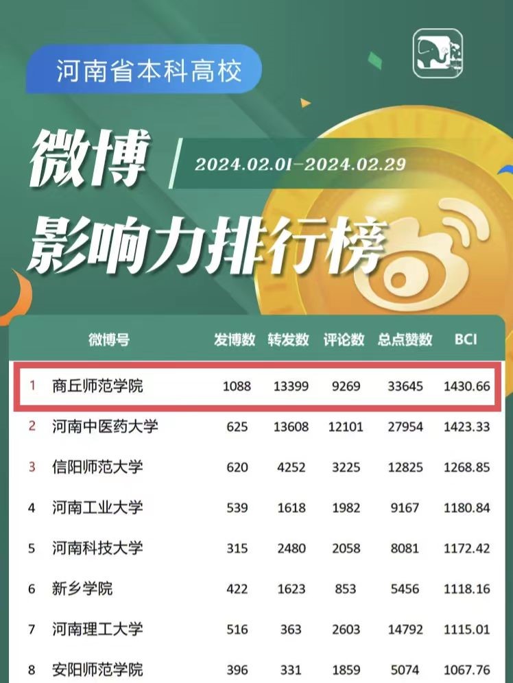 据了解,官方微博综合影响力指数(BCI)主要通过账号活跃度(发博数、原创微博数)和传播度(转发数、评论数、点赞数)两大维度来对微博账号进行评价。河南省教育厅根据和采用第三方平台(清博指数)监测到的数据,对2024年2月1日到2月29日期间河南省教育系统新媒体综合传播力进行排名并整理发布。排行榜对全省高校官方微博的内容质量、传播力和贡献力进行加权计算,得出总分,是目前在全省高校官方微博中影响力较大的综合评价体系。