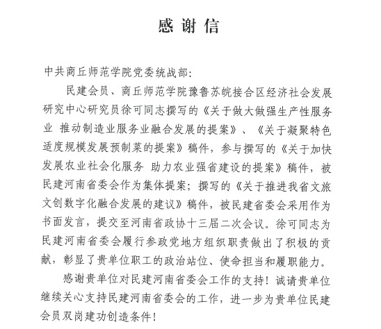 日前,我校收到中国民主建国会河南省委员会发来的感谢信,对我校民建会员、经济管理学院徐可博士参政议政方面的优异表现提出表扬,对学校的支持表示感谢。