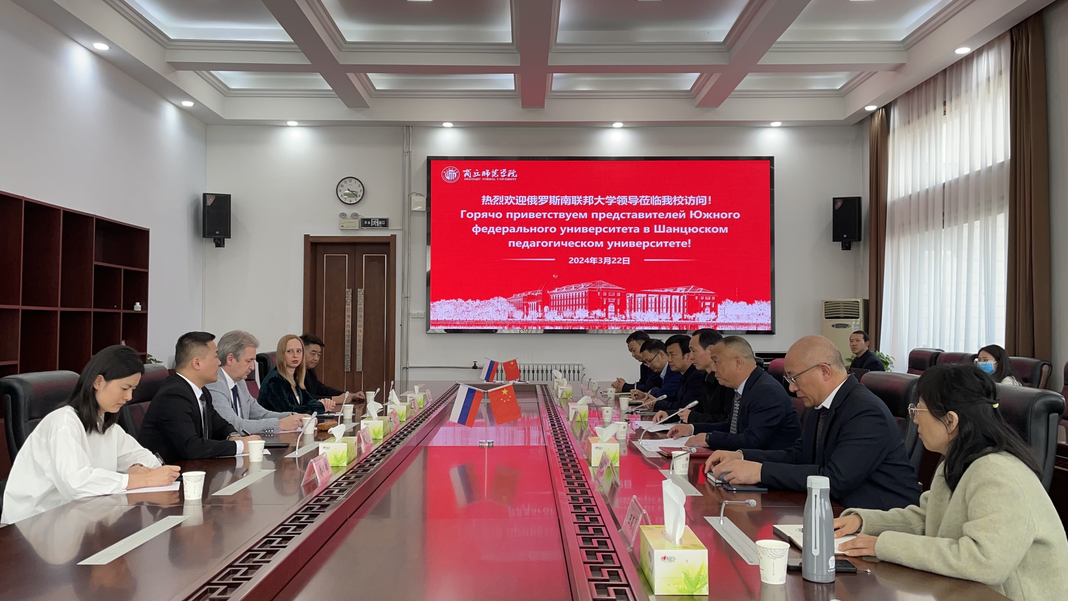 3月22日,俄罗斯南联邦大学校长全权代表(南联邦大学数学、力学和计算机科学学院院长,中俄人文合作中心科研项目副主席,南俄政府经济发展智囊团主席)卡里亚金·米哈伊尔·伊戈尔耶维奇先生,南联邦大学管理学院院长、中俄人文合作中心主席顾问扎西吉娜·叶琳娜·康斯坦丁诺夫娜女士一行访问我校。国际交流处接待并组织了合作洽谈会和学生交流等活动,副校长张箭出席活动。