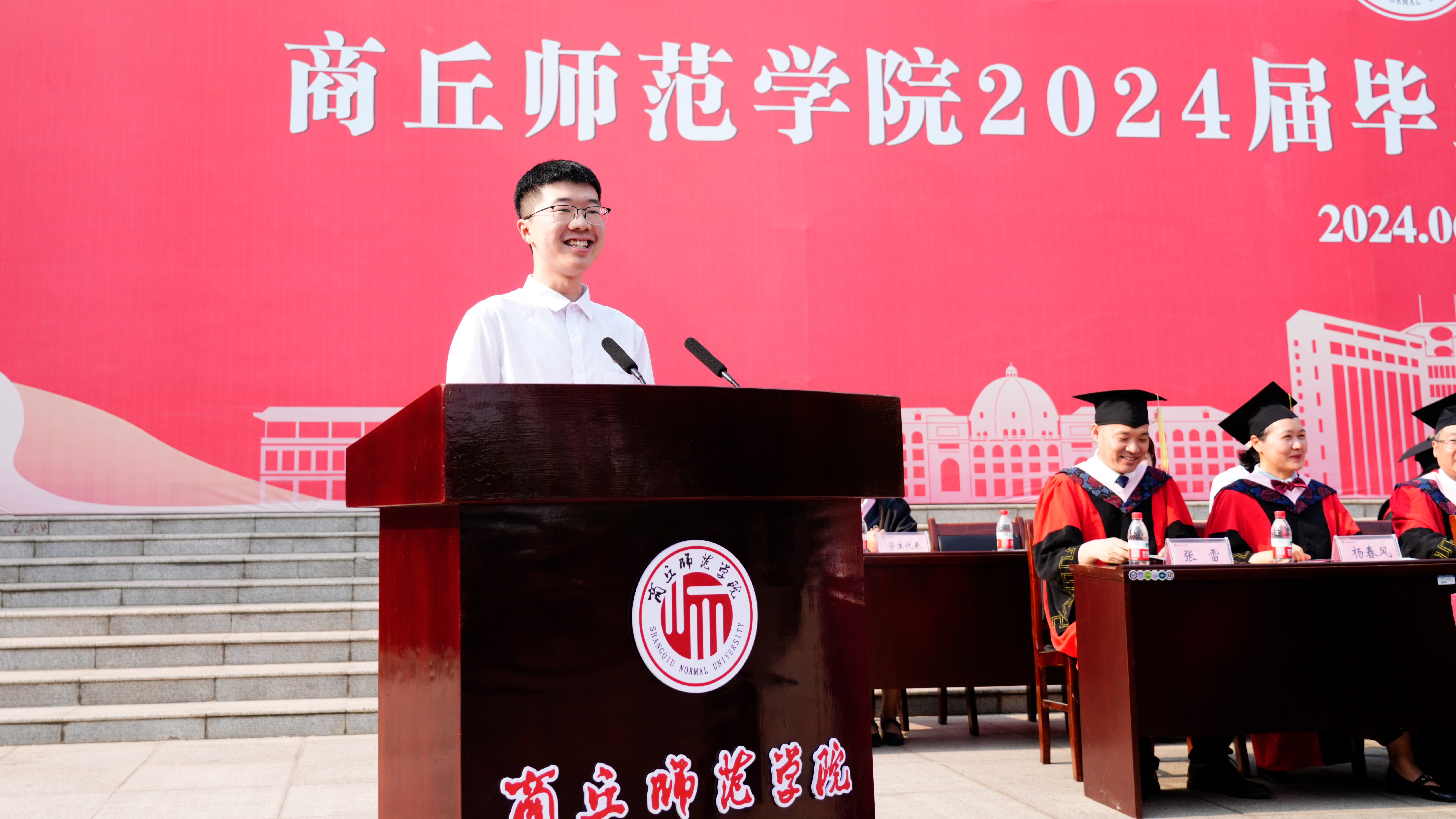 法学院2021级社会工作专业贾煜博同学作为在校生学生代表发言。他为毕业生送上美好祝福,表示将继承毕业生的奋斗精神,做走在时代前列的奋进者、开拓者、奉献者,用不懈的努力和卓越的成就来回报学校培养之情,让青春在党和人民最需要的地方绽放绚丽之花。