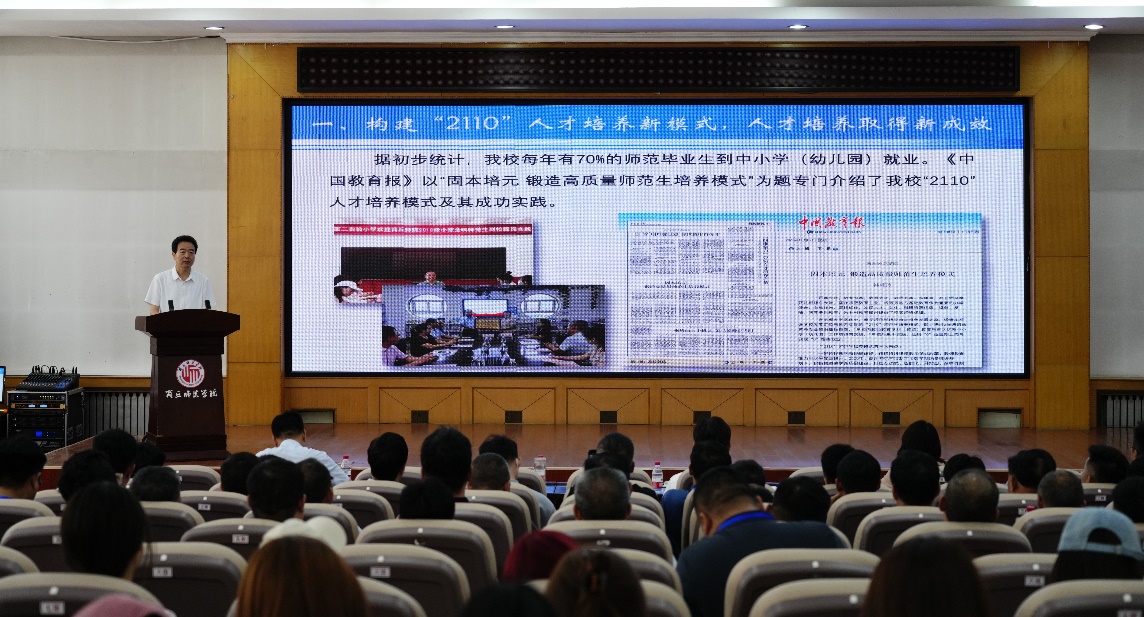 陈向炜代表学校对参加研讨会的领导、老师们表示热烈欢迎,向相关高中多年来对我校人才培养工作的支持表示衷心感谢。他从构建“2110”人才培养新模式,人才培养取得新成效、联合联动融合创新,服务基础教育呈现新气象、开展智慧教学专项行动,师范教育彰显新特色、实施课程教学范式改革,课程建设取得新进展、融合教师培训优质资源,服务基础教育展现新作为、创新校本培训机制,教师发展工作呈现新局面、借力协同提质计划,多措并举加快新发展七个方面介绍了我校独特的办学特色和显著的办学成就,并表示我校将加快高水平应用型大学建设步伐,持续提高人才培养水平,更好服务地方,回报社会。