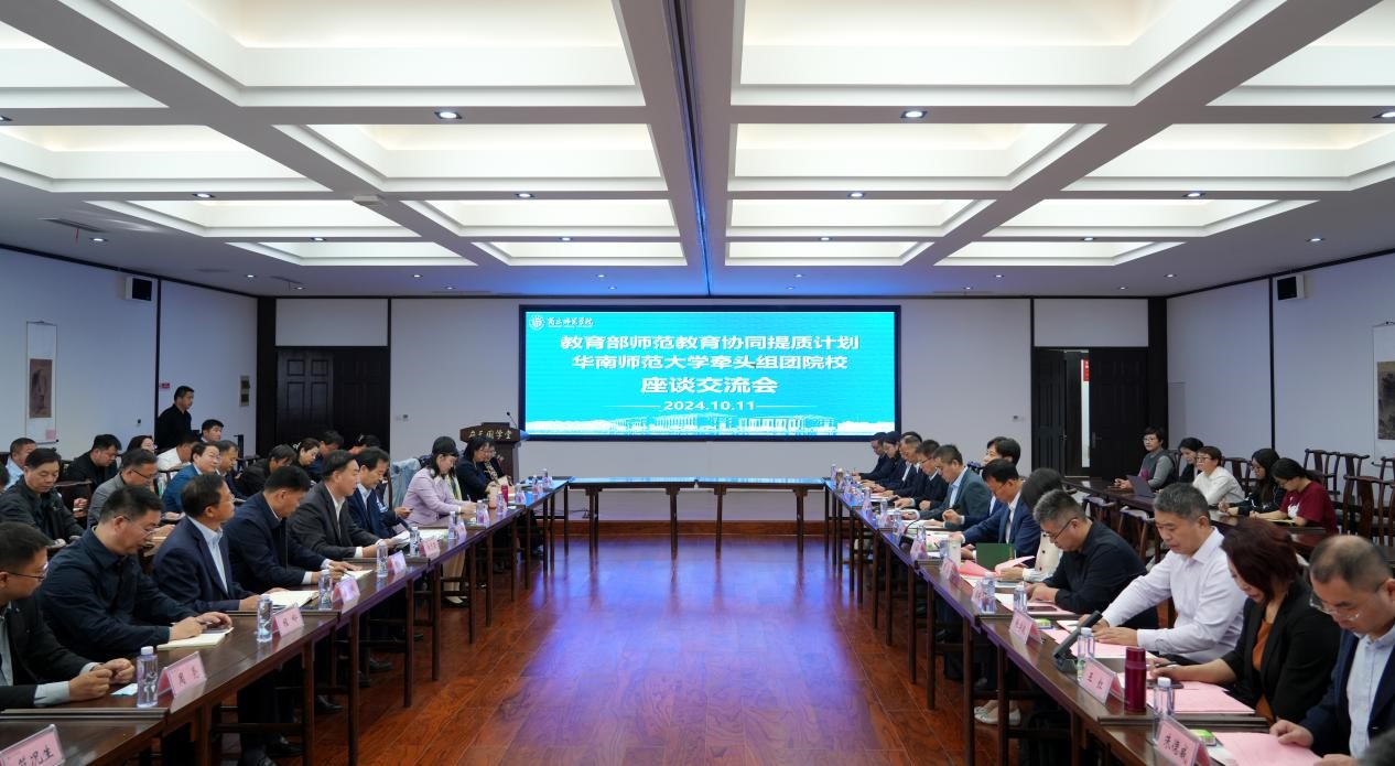 10月11日,华南师范大学校长杨中民一行来校调研师范教育协同提质计划实施情况。河南省教育厅教师工作处副处长张会敏、江苏师范大学副校长赵鹏、我校党委书记张志坚、校长陈向炜出席座谈会并参加有关活动。