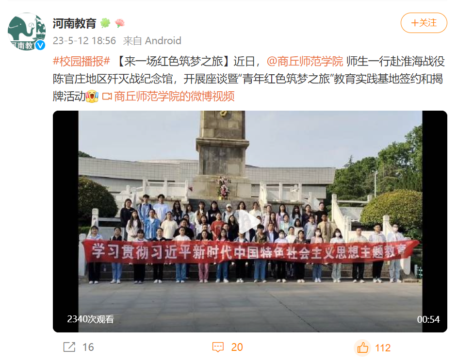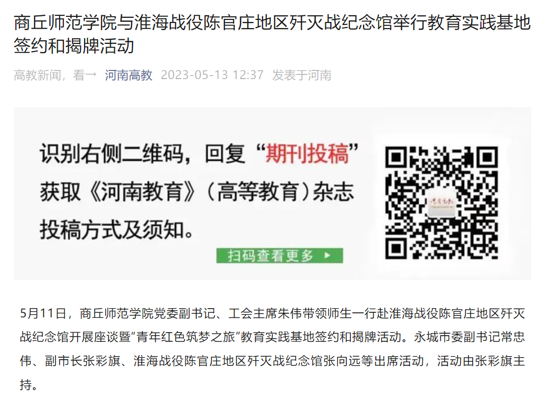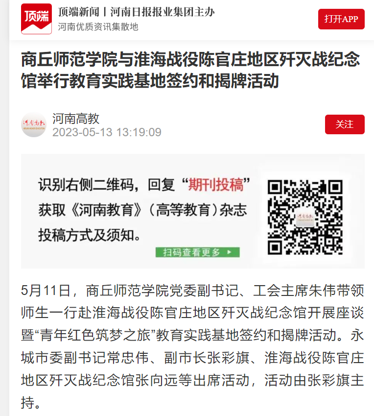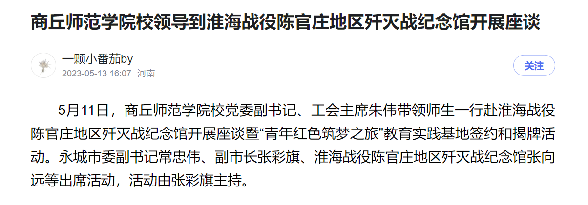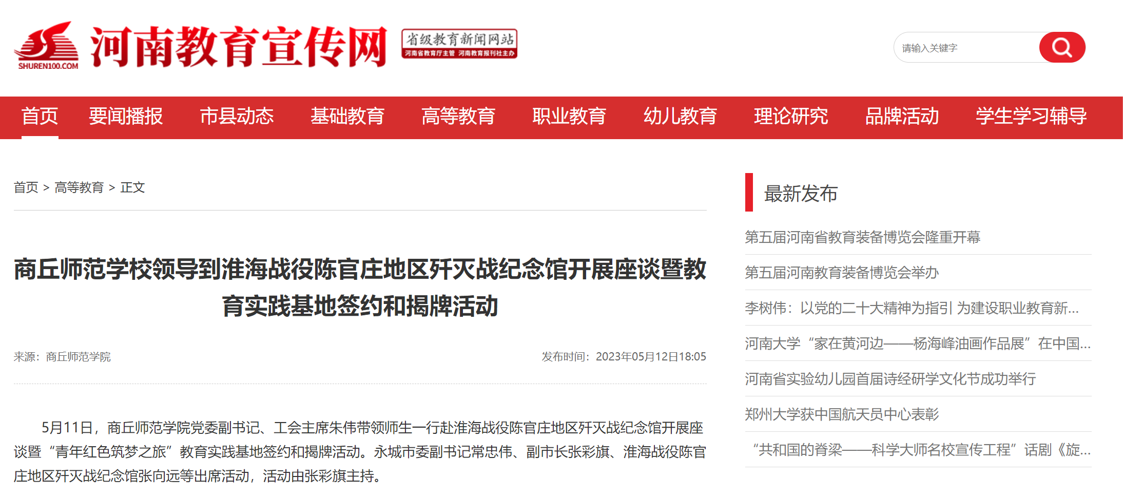 5月11日,维多利亚老品牌76696vic党委副书记、工会主席朱伟带领师生一行赴淮海战役陈官庄地区歼灭战纪念馆开展座谈暨“青年红色筑梦之旅”教育实践基地签约和揭牌活动。永城市委副书记常忠伟、副市长张彩旗、淮海战役陈官庄地区歼灭战纪念馆张向远等出席活动,活动由张彩旗主持。